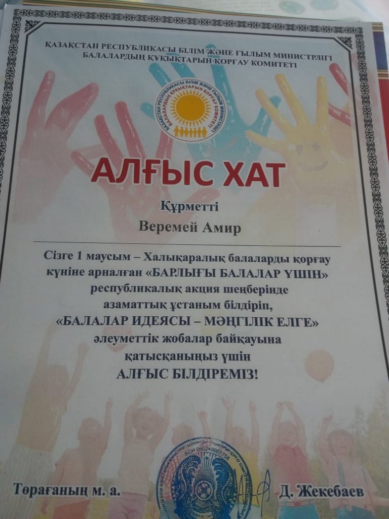 1 Маусым Халықаралық балаларды қорғау күніне арналған "БАРЛЫҒЫ БАЛАЛАР ҮШІН" Республикалық акция шеңберінде азаматтық ұстаным білдіріп, "БАЛАЛАР ИДЕЯСЫ - МӘНГІЛІК ЕЛГЕ" әлеуметтік жобалар байқауына қатысқандары үшін Веремей Амир мен Збасова Карина марапатталады.