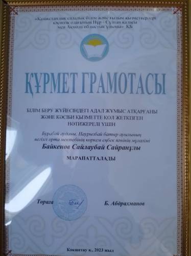 облыстық кәсіопдақ ұйымының төрағасының Құрмет грамотасымен Білім беру жүйесіндегі адал жұқмыс атқарған және кәсіби қызметте қол жеткізген нәтижелері үшін Бурабай ауданы, Наурызбай батыр ауылының негігі орта мектебінің көркем еңбек пәнінің мұғалімі Байкенов Сайлаубай Сайран ұлы марапатталады.