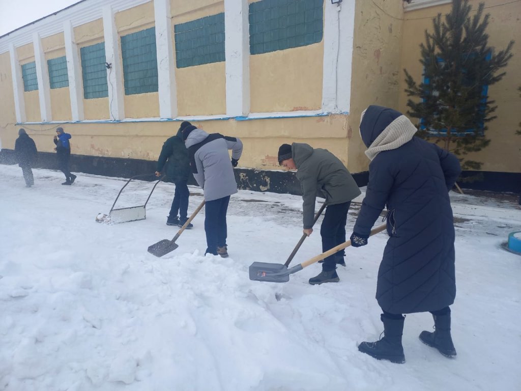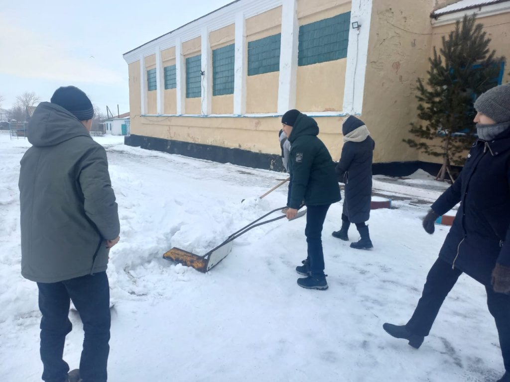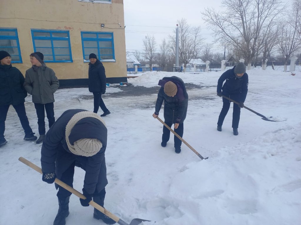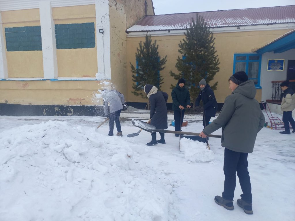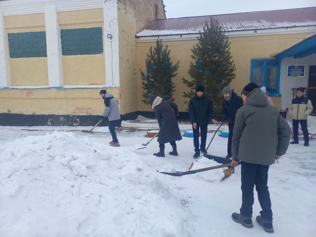 "Мектеп аумағын қардан тазарту" акциясы. Акцияға оқушылар, мектеп қызметкерлері қатысты.