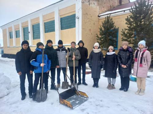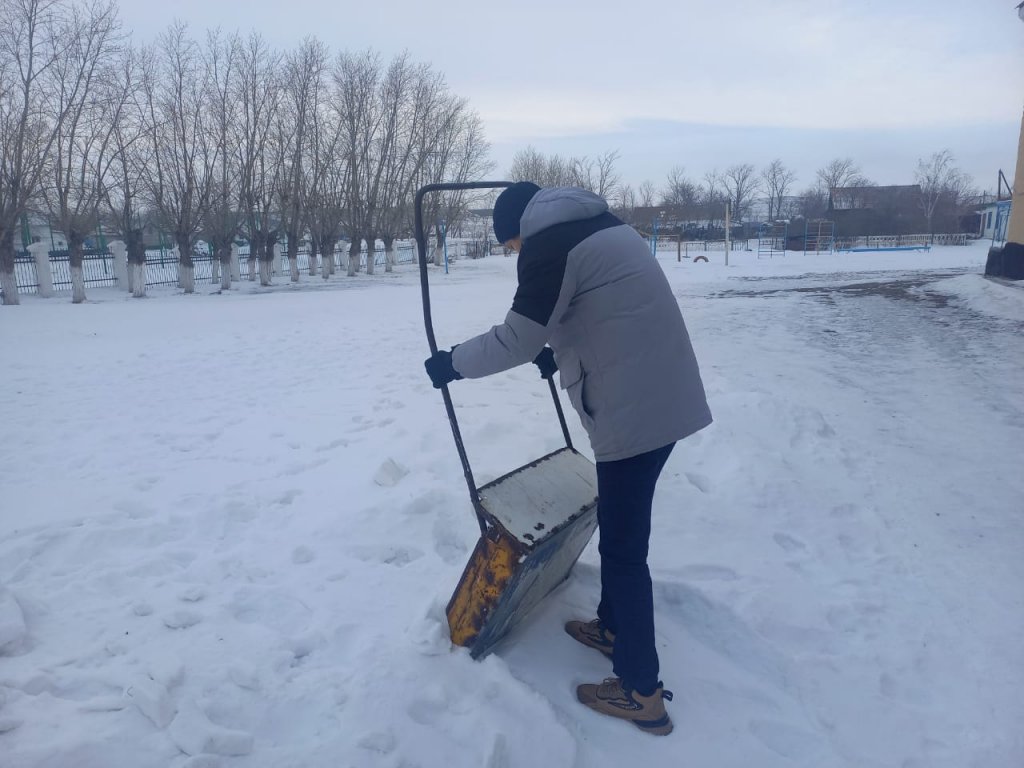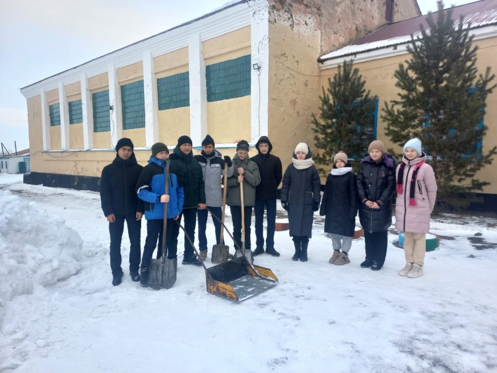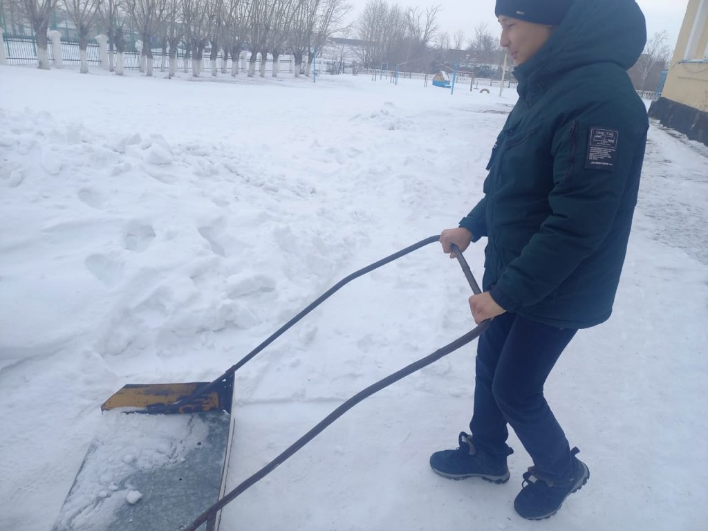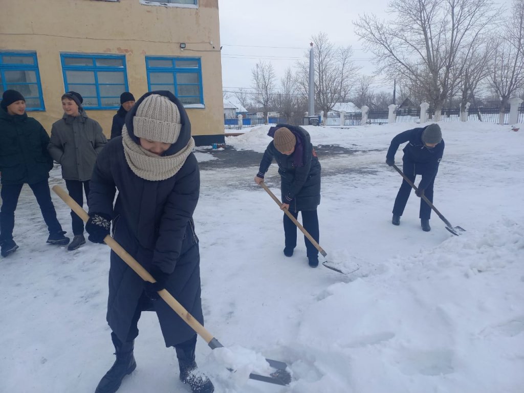 "Мектеп аумағын қардан тазарту" акциясы. Акцияға оқушылар, мектеп қызметкерлері қатысты.